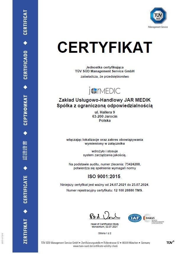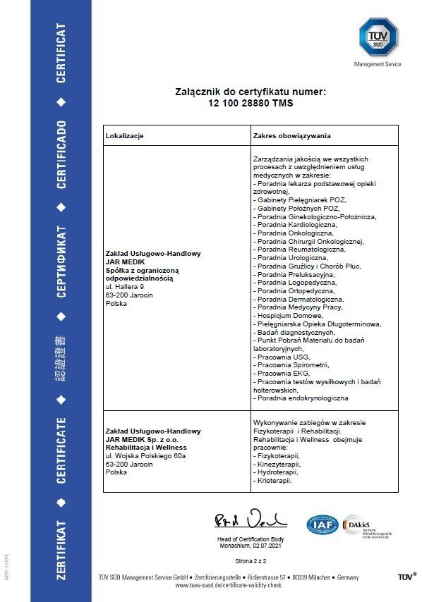 Od czerwca 2006 roku nasza przychodnia nieprzerwanie posiada certyfikat jakości zgodny z normą ISO 9001 (obecnie ISO 9001:2015). Natomiast od września 2017 roku posiadamy również certyfikat bezpieczeństwa informacji zgodny z normą ISO/IEC 27001:2013. Zakończyliśmy w ten sposób kolejny etap rozwoju naszej przychodni, podnosząc jakość usług i bezpieczeństwa danych naszych pacjentów. Cały czas dokładamy wszelkich, aby nasza placówka wyposażona była w nowoczesny sprzęt medyczny. Posiadana przez nas aparatura medyczna posiada polskie i europejskie certyfikaty oraz spełnia wymagane normy sanitarne, czego dowodem są między innymi uzyskane Certyfikaty.